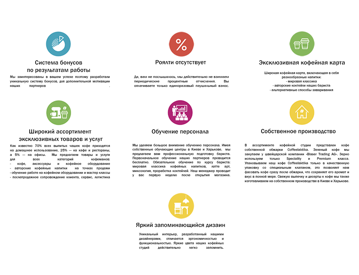 Объем инвестиций зависит от многих факторов, включая место расположения и состояние помещения. В среднем, инвестиции составляют порядка 50 тыс.евро, включая паушальный взнос и стартовую закупку. Паушальный взнос составляет 10 тыс.евро и является единоразовым платежом вне зависимости от количества открытых магазинов. Cтартовая закупка товара и продукции для работы магазина составляет 20 тыс.евро., в неё входит как оборудование для работы, так и продукция для реализации. Ориентировочно возврат инвестиций занимает около 12-24 месяцев, но каждый регион и место расположения кофейных студий имеют свою специфику. |